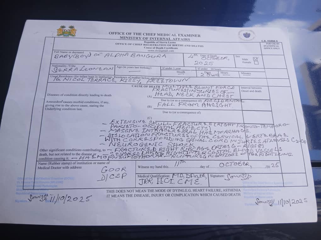 On Saturday 11th October 2025, Dr. Owizz performed an autopsy on the baby who allegedly died after being exposed to teargas fired by police forces at Kuntorlor in Freetown.